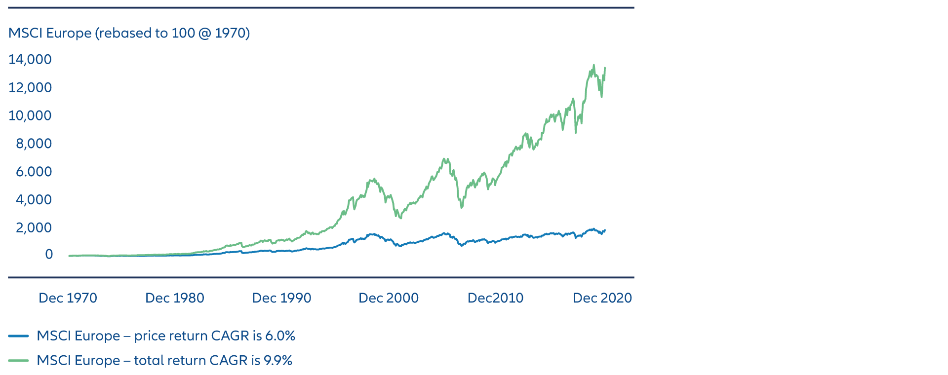 • In developed regions such as Europe, dividends’ contribution to total returns over time has been high and should not be overlooked.