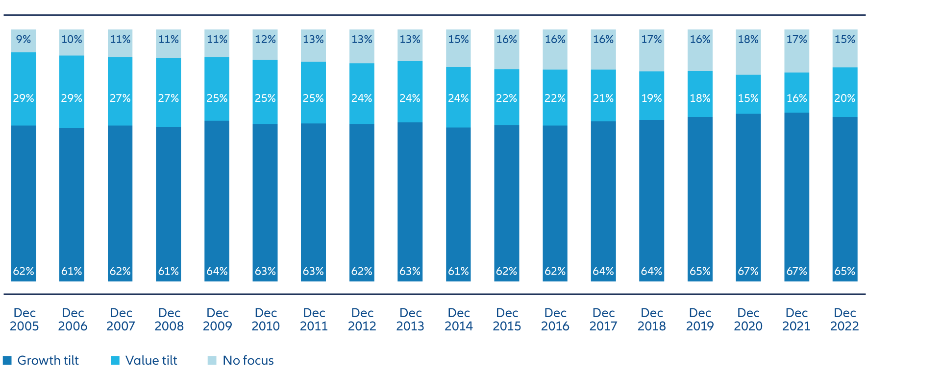 Exhibit 3 shows that the recent pronounced bias to growth stocks has not always been the case, and this recent trend may already be changing, with an increased allocation to value in 2022.
