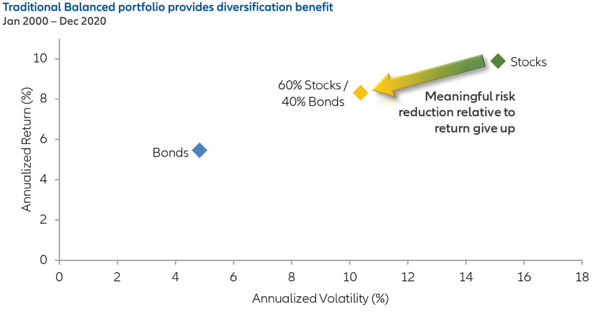 Source: Bloomberg, ICE Data Services, Allianz Global Investors. Data as of Jan 2000 to Dec 2020. Bonds are represented by 20% ICE BofA 1-10Yr US Treasury & Agency Index/50% ICE BofA 1-10Yr US Corporate Index/30% ICE BofA US High Yield Index; Stocks represented by S&P 500 Index. The information above is provided for illustrative purposes only, it should not be considered a recommendation to purchase or sell any particular security or strategy or an investment advice. Past performance is not indicative of future performance.