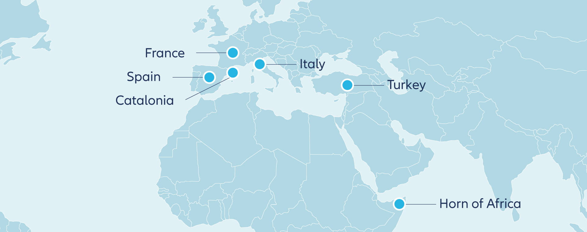 During the winter of 2022-2023, Europe and several other regions in the world faced severe drought conditions, quite an unusual phenomenon for the wintertime. Europe’s major waterways like the Po and the Rhine experienced record-low water levels already in midwinter. Countries such as Spain, Portugal, Italy, and Turkey experienced low levels of rainfall, leading to decreased water supply for agriculture and urban use. The drought also affected hydropower production, contributing to increased electricity prices and the need for alternative energy sources. The lack of snowfall in the Alps will lead to lower snow smelting in spring and summer for countries like France, Switzerland, and Italy. Here, the Snow Water Equivalent (SWE, a measure that indicates how much liquid water is stored in the snow), as of end of January 2023 showed a deficit of 35% compared to the average SWE of the past ten years.3 Considering that around 60% of the water flowing in Italian rivers derives from melted snow, low snow levels can be harbingers of an impending new drought season.