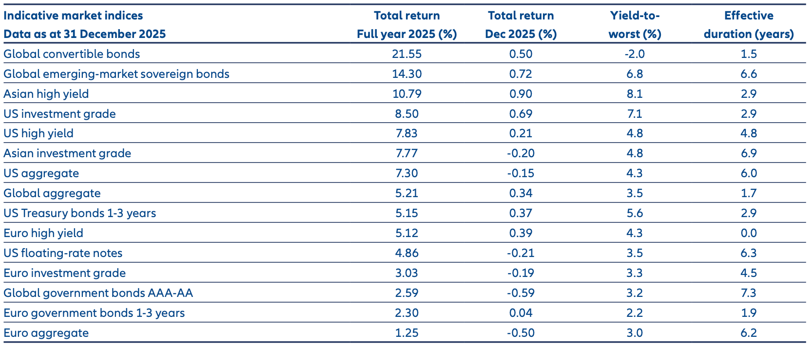 Bloomberg, ICE BofA and JP Morgan indices; Allianz Global Investors, data as at 31 December 2025. Index returns in USD-hedged except for Euro indices (in EUR). Asian and emerging-market indices represent USD denominated bonds. Yield-to-worst adjusts down the yield-to-maturity for corporate bonds which can be “called away” (redeemed optionally at predetermined times before their maturity date). Effective duration also takes into account the effect of these “call options”. The information above is provided for illustrative purposes only, it should not be considered a recommendation to purchase or sell any particular security or strategy or as investment advice. Past performance, or any prediction, projection or forecast, is not indicative of future performance.