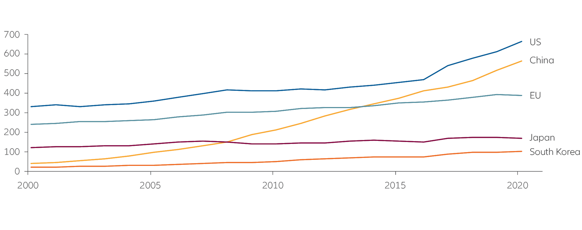 Evidence of China’s new wave of innovation abounds. It is already the world’s largest market for electric vehicles (EVs), accounting for about 40% of global sales; it is the world leader in renewables, with more than 70% of global output across the solar production chain; it has more than 1,000 new drugs currently in development; and is the world’s largest market for industrial robots.