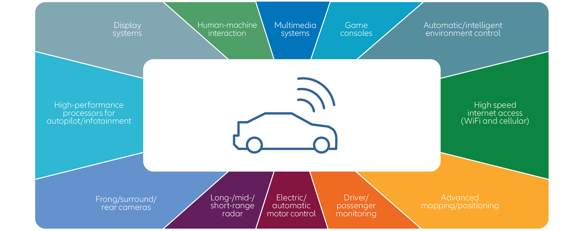 Semiconductors are probably even more important for the country’s future ambitions. By value, China imports more semiconductors than it does oil. The chips are the key commodity for various aspects of manufacturing tech. Just consider EVs: as Exhibit 2 shows, semiconductors are needed for functions including motor control, cameras, human-machine interaction, high-performance processors, display systems and many other features. As demand for the technology underpinned by semiconductors rises, so demand for the semiconductors themselves will likely rise in line.