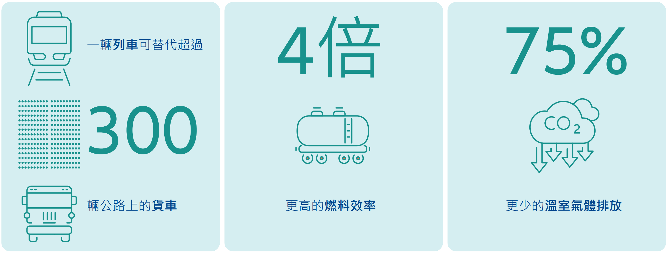 並不局限於成本及環境因素。美國方面,鐵路行業為超過160,000人提供需要熟練技能的工作崗位,且僱員是工會成員,他們賺取的收入較美國人的平均工資水平高出逾50%。鐵路工作崗位在安全性方面亦表現突出,僱員遭遇工傷的機率遠低於其他運輸行業。2因此,鐵路在社會(S)、管治(G)及環境(E)方面均表現出色。