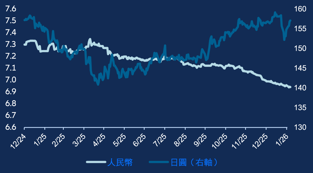 我們預期 2026 年的宏觀經濟結果區間將較為收斂。在我們的基本情境中,經濟呈現類再通膨(reflation)格局,整體金融環境維持寬鬆,為收益型策略(carry)提供有利條件。此外,我們亦觀察到人民幣於近期數週開始呈現加速升值的態勢。